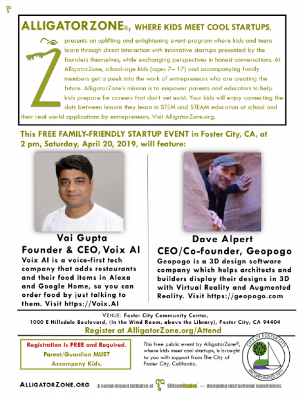 This free public event by AlligatorZone, where kids meet cool startups, is brought to you with support from the City of Foster City. To learn more, read the press release here.
