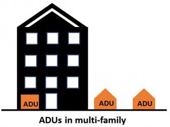 | Conversion ADU no more than 25% of the existing multifamily dwelling units | Up to 2 detached ADUs on a lot with a proposed multifamily dwelling | Up to 8 detached ADUs on a lot with an existing multifamily dwelling; ADUs not to exceed the number of existing multifamily units | Up to 1 attached ADU up to 1,200 square feet but no more than 50% of the existing or primary dwelling, whichever is less, on lot with an existing multifamily dwelling. |